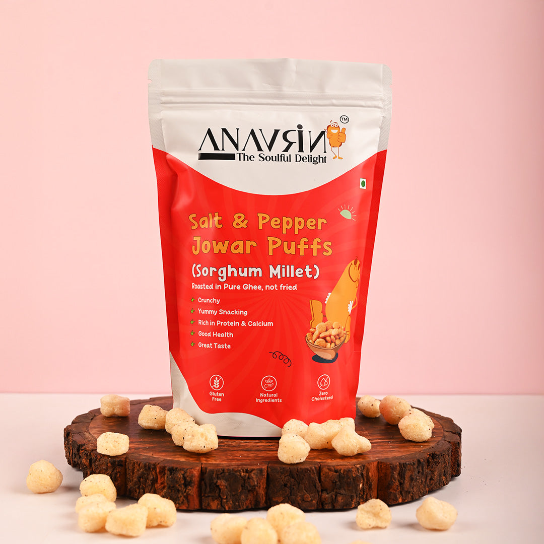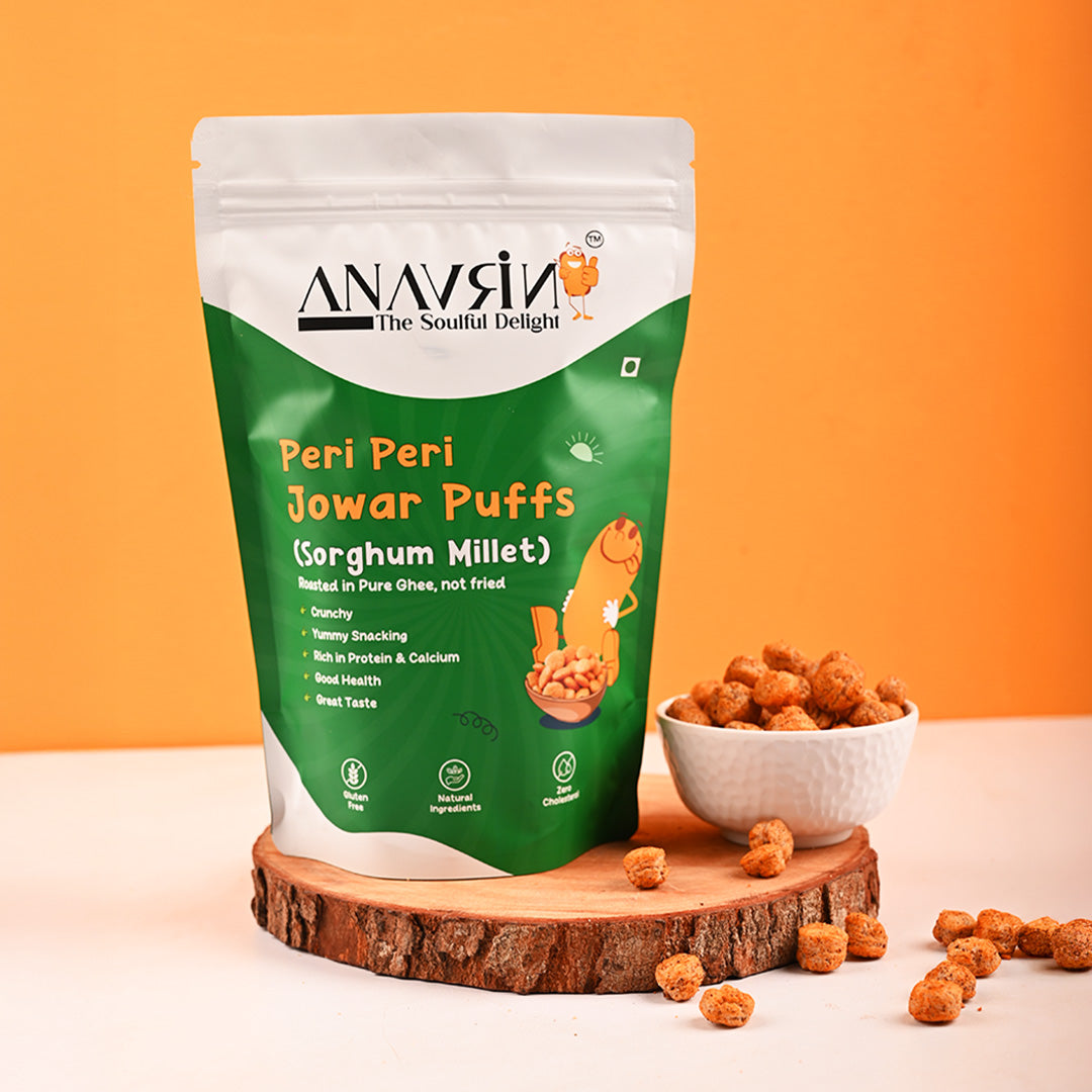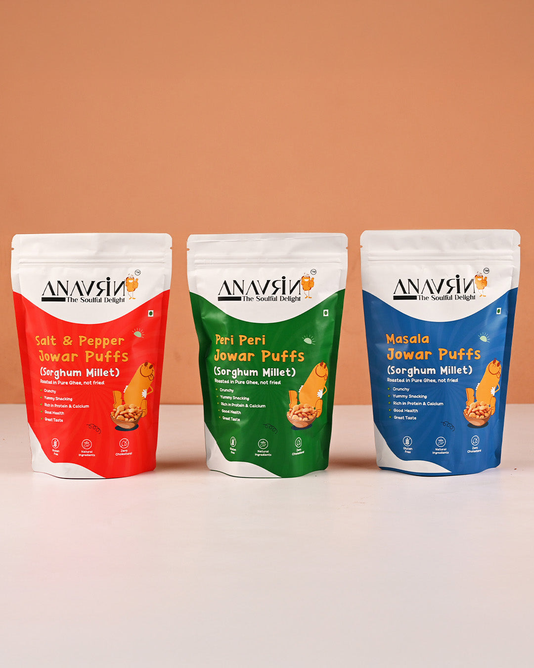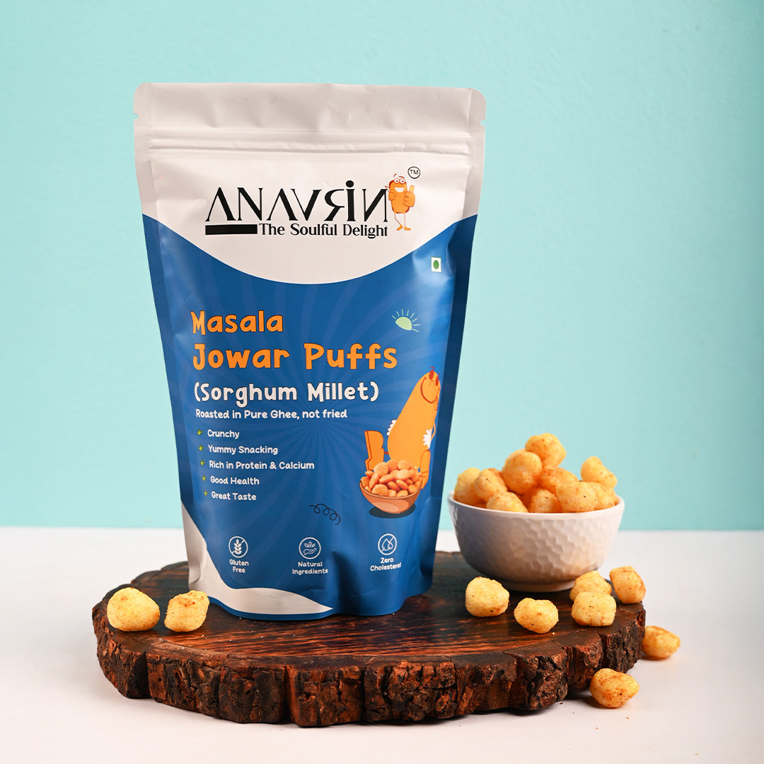 Jowar puffs, almonds, cashews, peanuts, spices and condiments (chilli, black pepper, oregano, parsley, garlic powder, onion powder, sugar, salt, dried mango powder), salt, pure ghee