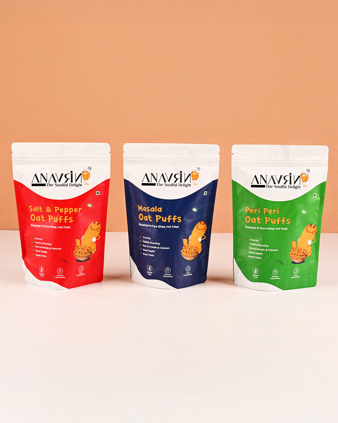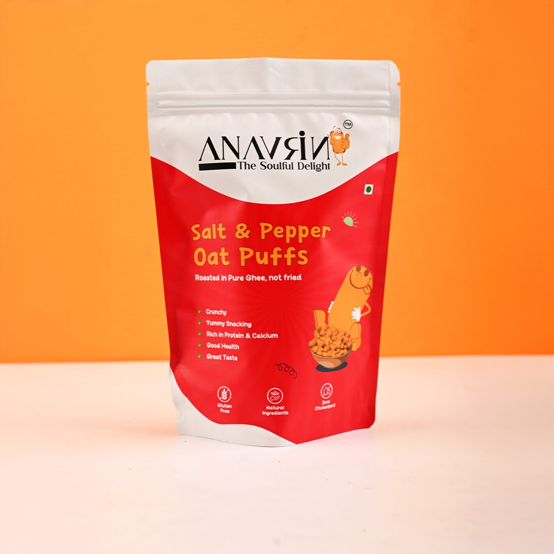 Oat puffs, almonds, cashews, peanuts, salt, pepper, pure ghee